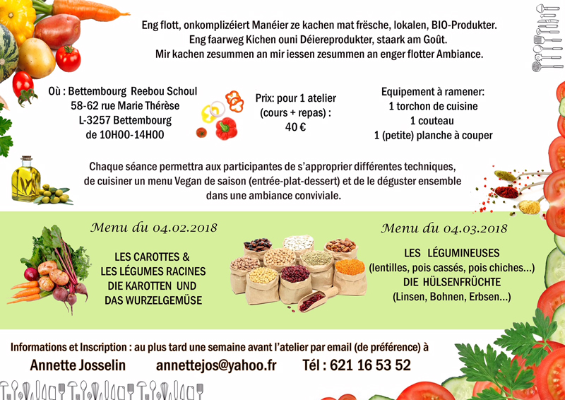 Dans le cadre des formations initiés par le groupe du jardin communautaire "JacquinotsGaart" la MJC Bettembourg organis un atelier de cuisine qui vous propose une cuisine: